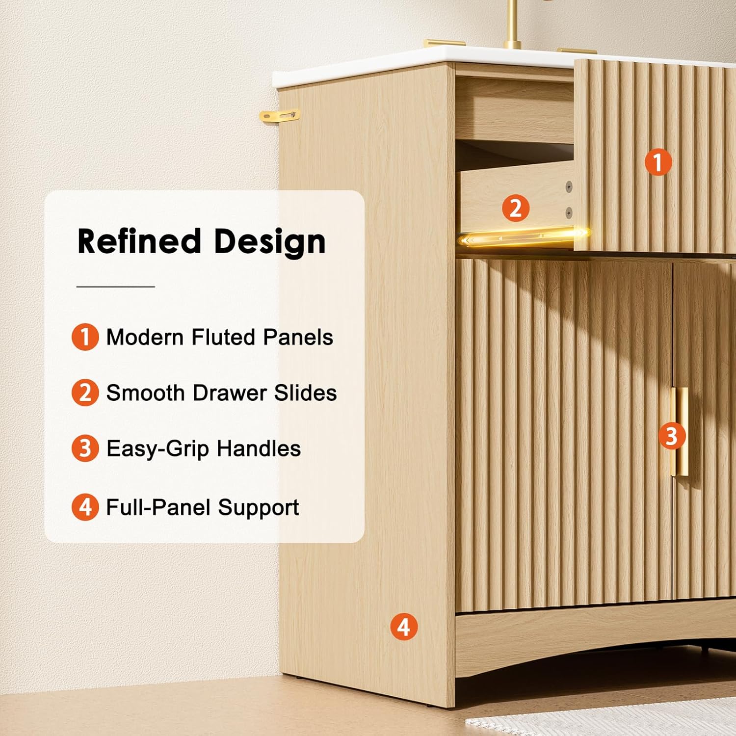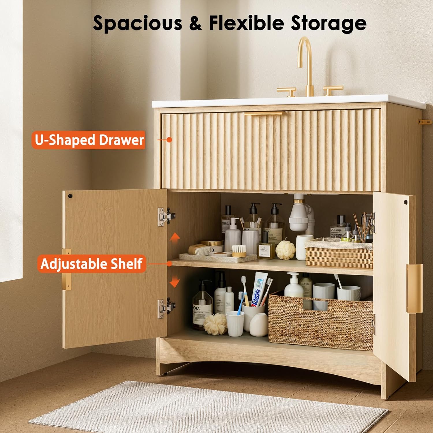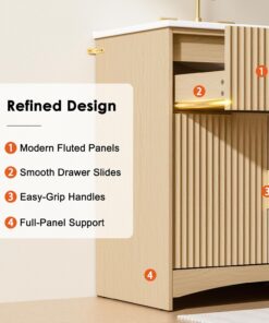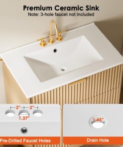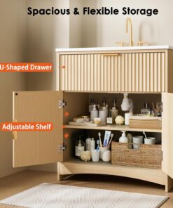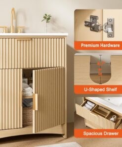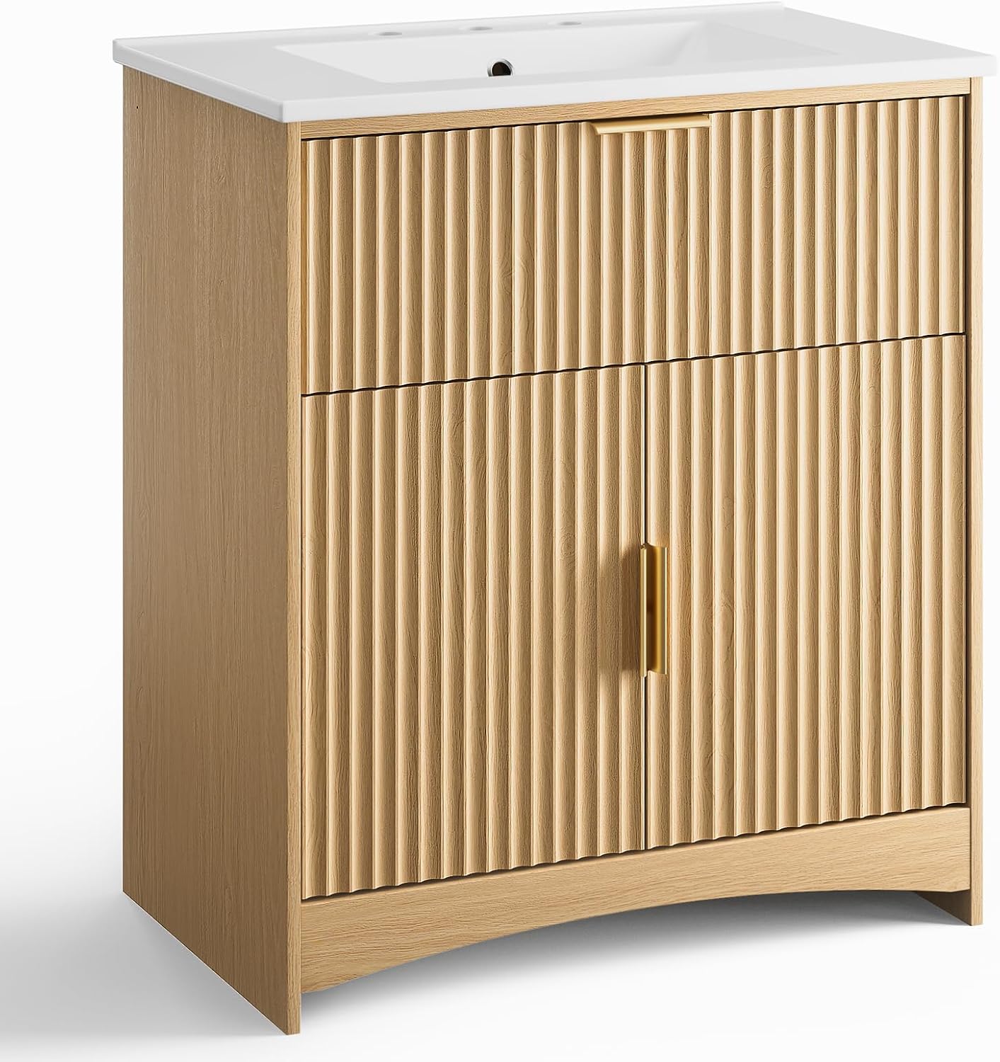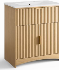AMADA HOMEFURNISHING 30 in Bathroom Vanity with Ceramic Sink Fluted Free Standing Cabinet Natural Oak
