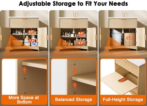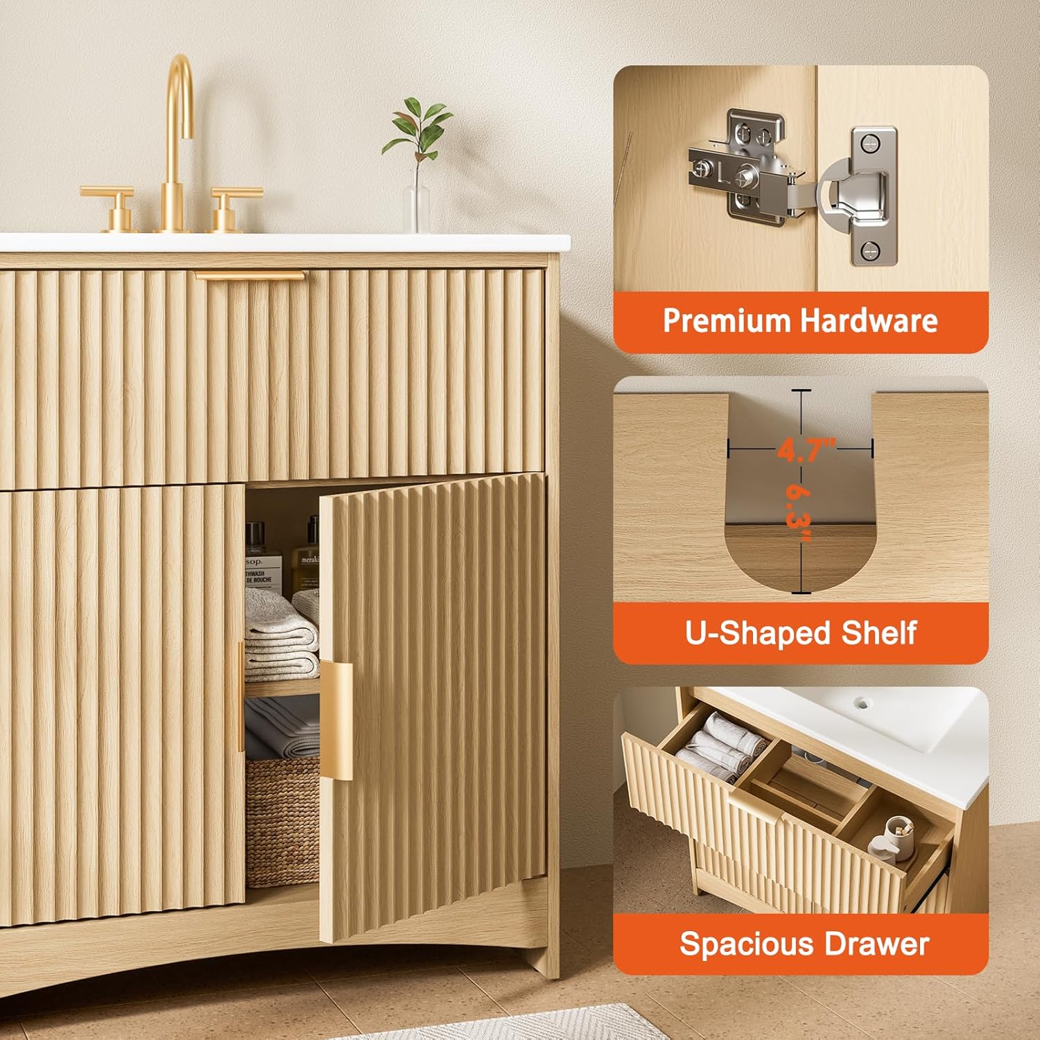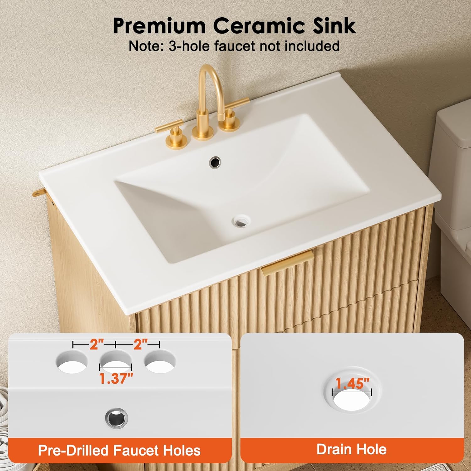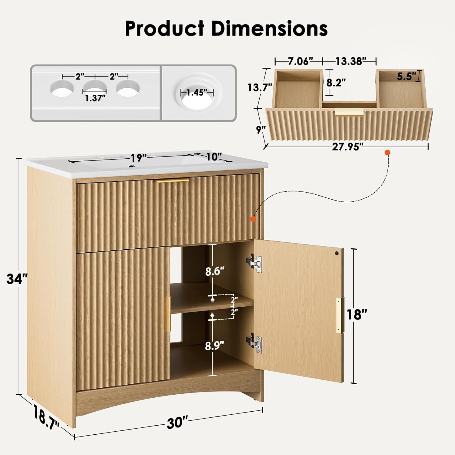 AMADA HOMEFURNISHING 30 in Bathroom Vanity with Ceramic Sink Fluted Free Standing Cabinet Natural Oak