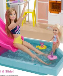 - Dreamy features include a working elevator, party room with a DJ booth, second-story slide with a pool, balcony with a repositionable hammock swing and a puppy play area with its own pool and slide. Dolls not included
