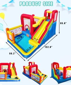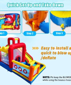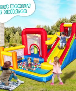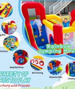 - 【Rich Gameplay】The kids bounce house combines plenty of popular playing areas, including mysterious Obstacle Poles full of children’s fun, Long Slide, Inflatable Trampoline, Ball Pit/Water Pool, Basket, 3 Shooting Nets and Climbing Wall. Children can bounce, slide, climb and throw at will to experience different happiness. The unique design and brightly colored shapes of bounce castle will keep kids entertained for hours of family fun.