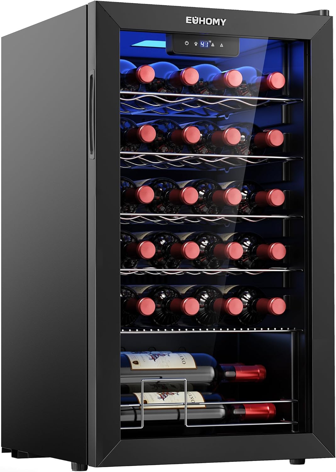 - 【Double-Layer Glass Door】Mini fridge glass door with double-pane thermopane glass insulates against external temperature fluctuations and blocks harmful UV rays to prevent flavor degradation. This wine fridge small also includes soft internal LED lighting that protects your wine’s flavor and labels, allowing this mini wine fridge beautifully showcase your collection.