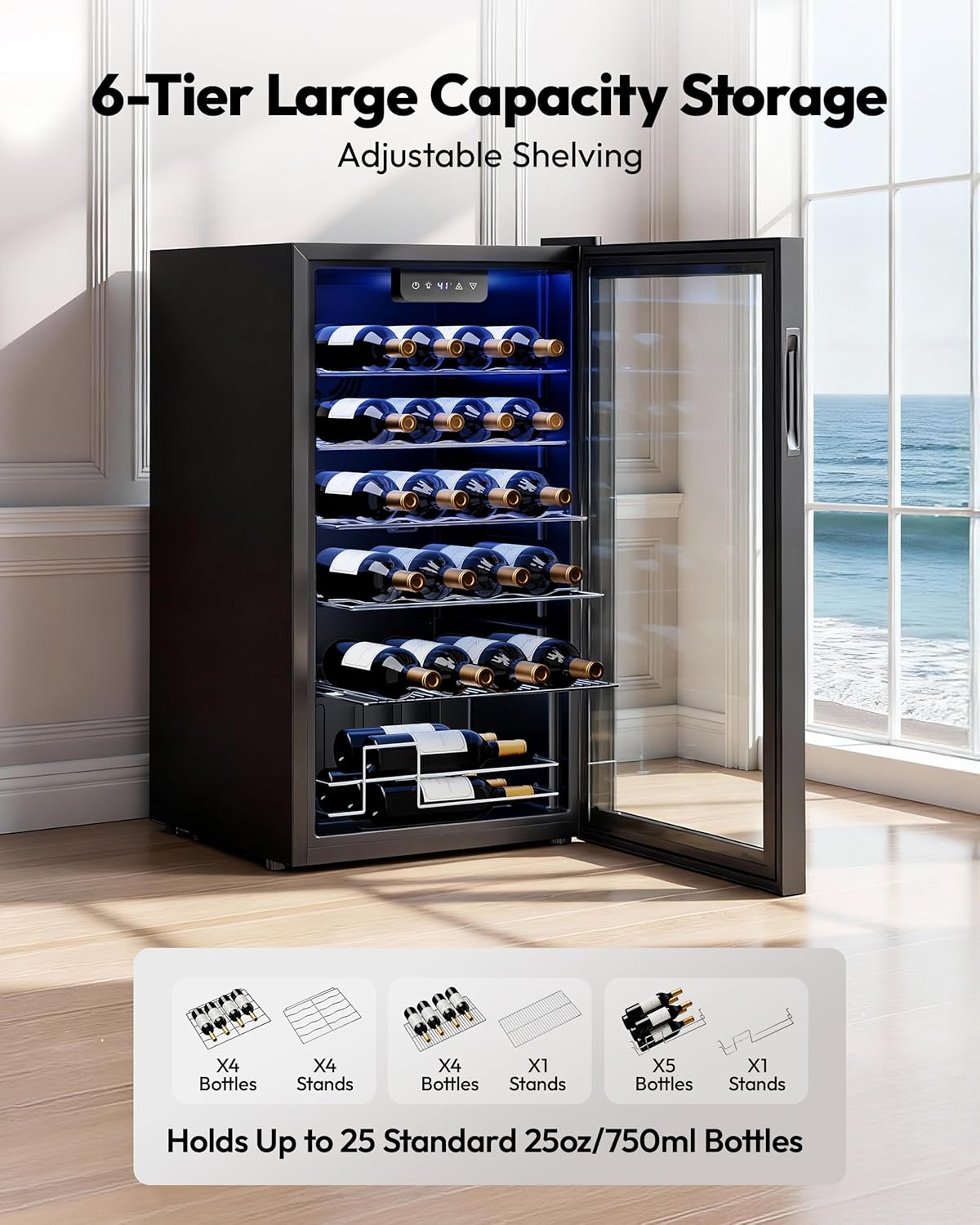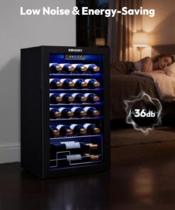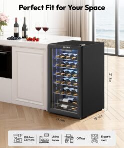 - 【Adaptable Storage for 25 Bottles】Measuring 18.7″D x 17.5″W x 31.3″H, this wine cooler refrigerator fits seamlessly under counters or as a freestanding unit in your kitchen, bar, or office. Wine refrigerator is designed with 4 chrome full-width wine racks, 1 full-width flat shelf and bottom compartment, allowing you to effortlessly reconfigure the interior to accommodate a diverse collection of up to 25 standard 750ml bottles.