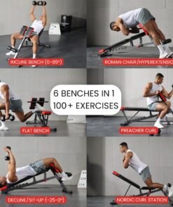 - 1 Workout Bench, 100+ Exercises – Perform a wide variety of exercises with this home gym equipment as your back extension machine, roman chair, sit up bench, incline bench, decline bench, preacher curl bench, or flat bench workouts using weight set.