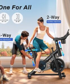 - User-Friendly Design for All Riders: This stationary exercise bike for adults features a device holder, dual water bottle holders, non-slip caged pedals, transport wheels, and leveling knobs. Enjoy a personalized fit with a 2-way adjustable handlebar (36.1–39.9 in) and a 4-way adjustable padded seat (32.4–40.6 in), ideal for users ranging from 4’8″ to 6’2″ in height.