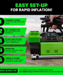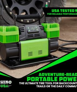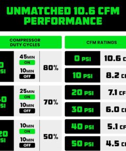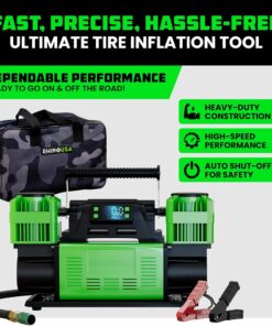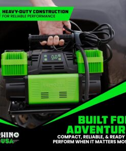 - HIGH-POWER 12V PORTABLE AIR COMPRESSOR – This heavy-duty 12V pump delivers an impressive 10.6 CFM flow rate to inflate large off-road or highway tires quickly and reliably. A must-have addition to your car accessories kit for trail or travel.