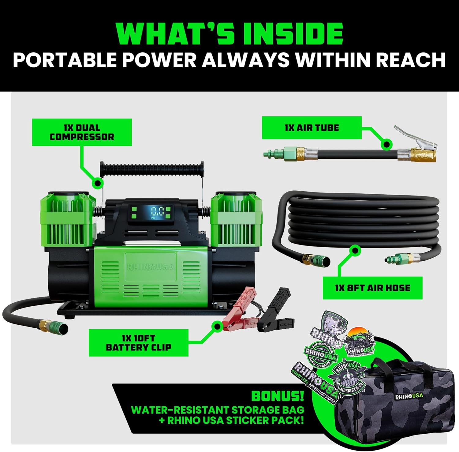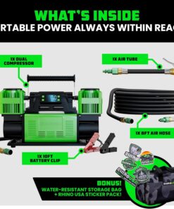- SERVICEABLE FILTERS + EXTENDED BATTERY CLAMPS – Cleanable air filters help extend compressor life and maintain top performance. Includes long-reach battery clamps for quick, secure 12V connections without struggling around the engine bay.