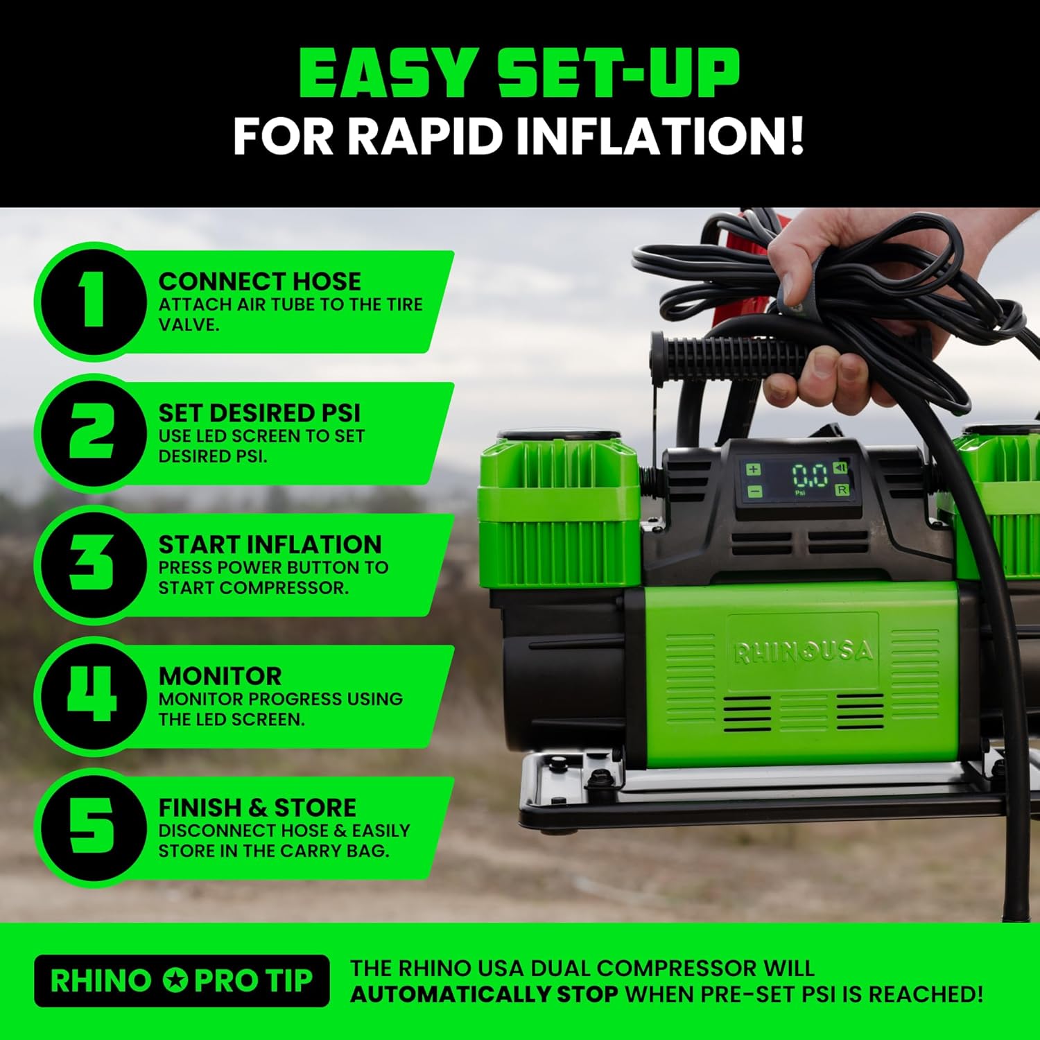- AUTO SHUTOFF WITH BUILT-IN TIRE PRESSURE GAUGE – Set your desired PSI using the LED-backlit screen and built-in tire pressure gauge. The compressor automatically stops when the target pressure is reached for safe, accurate inflation every time.