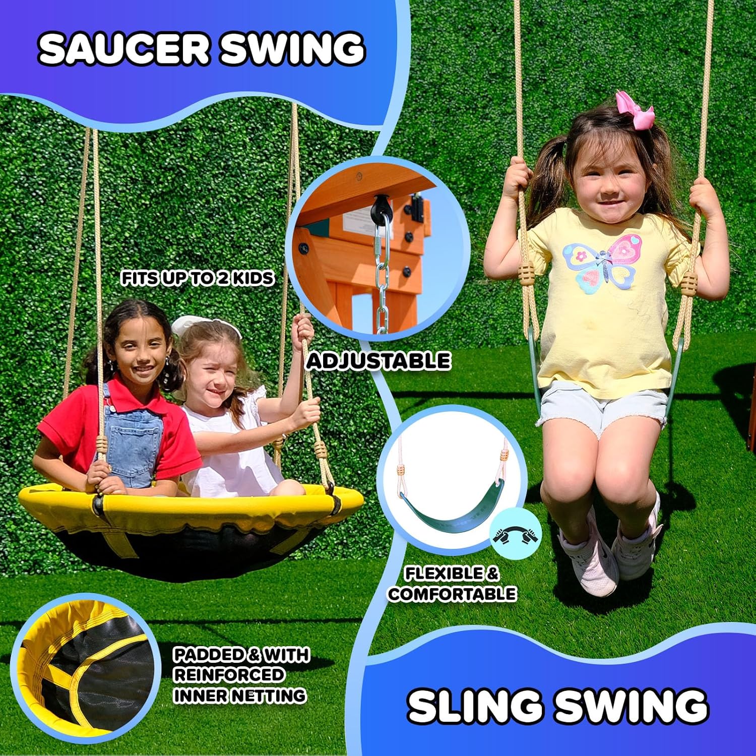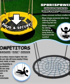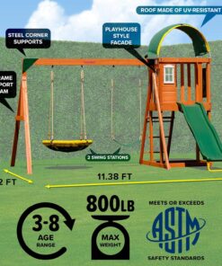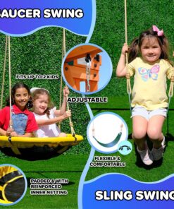 - EXTRA COMFORT: Sportspower Amelia Wooden Swing Set includes a padded saucer swing for up to 2 children to swing on with ASSEMBLED DIMENSIONS measuring 10.25’L x 9’W x 8.1’H