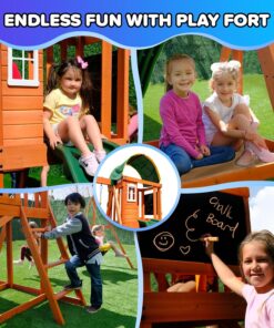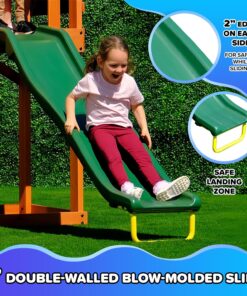 - OUTDOOR FUN: Sportspower Amelia Wooden Swing Set is feature-packed with a 6ft blow molded slide, a 2-person saucer swing, 1 height adjustable swing, 1 sandbox (sand not included) and 1 playfort with UV-resistant canopy. Up to 5 kids can play at once, 500 lbs maximum weight