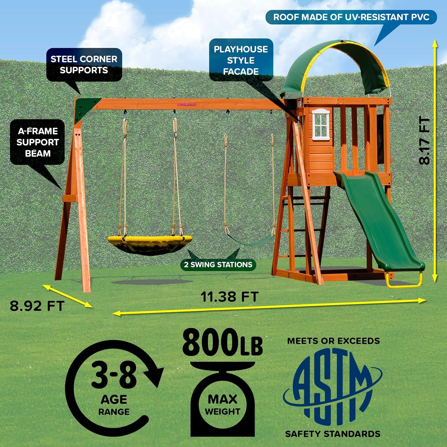 - SAFE DESIGN: Sportspower Amelia Wooden Swing Set meets or exceeds all ASTM safety standards. Age range: 3 to 8 years old