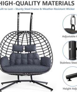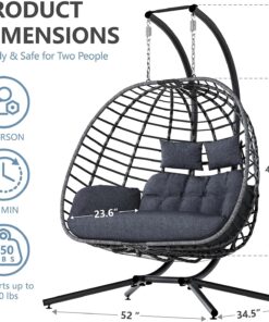 - Durable & Weather-Resistant: Built with a heavy-duty alloy steel frame and UV-resistant wicker, this double egg chair outdoor withstands various weather conditions. Whether it’s sun, rain, or wind, the hanging double egg chair with stand offers durability year-round