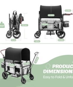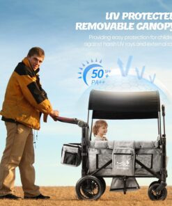 - Wagon with Canopy:The sliding and detachable canopy protects kids from sun and rain. Equipped with a 5-point safety harness and spacious foot area, it’s perfect for the beach, park, camping, and more