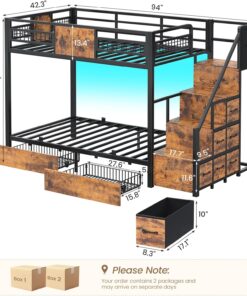 BTHFST Twin Over Twin Bunk Bed with Stairs LED Lights Storage Drawers Metal Frame