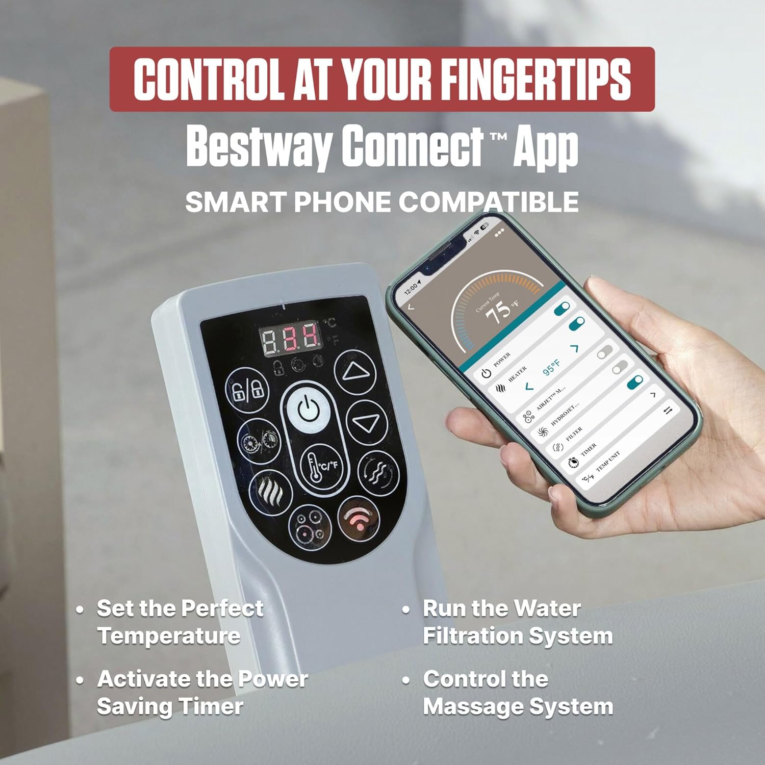 - CONTROL WITH YOUR SMARTPHONE: Compatible with the Bestway Connect app that allows you to control the temperature, timer, filter and AirJet massage system; Includes a multi-function pump, which also inflates the hot tub, controls the heat setting (up to 40ºC/104ºF), and runs the filtration system