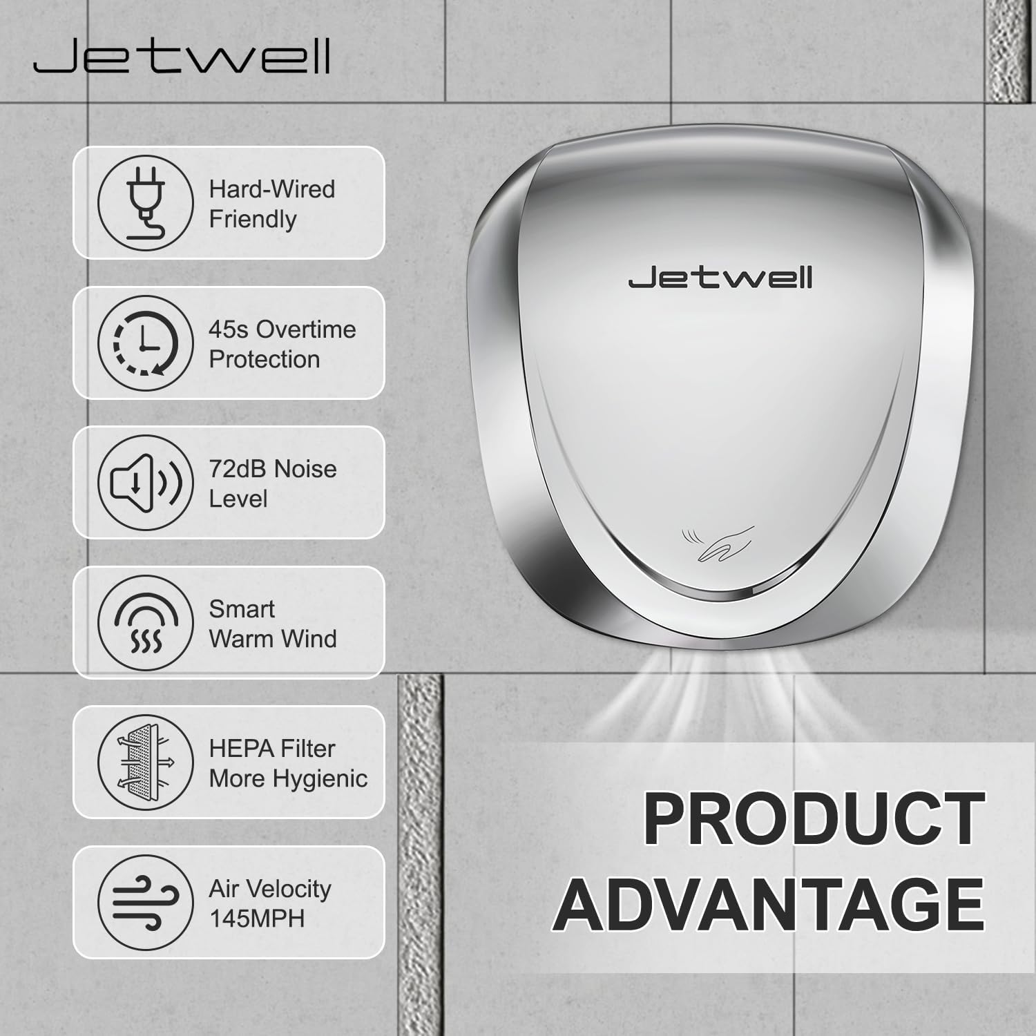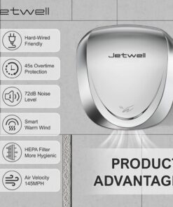 - Specifications: Operates on AC 100V-130V with a power of 1450W at 50/60Hz, drawing 12 amps at 120 volts. Provides an airflow of 140M³PH with wind speeds reaching 145 MPH, drying hands within 7-10 seconds. The noise level is 70 dB