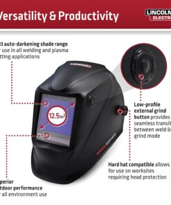 - Extra Large Viewing Area – The 12.5 square inch auto darkening lens provides a large field of view to increase versatility and operator control