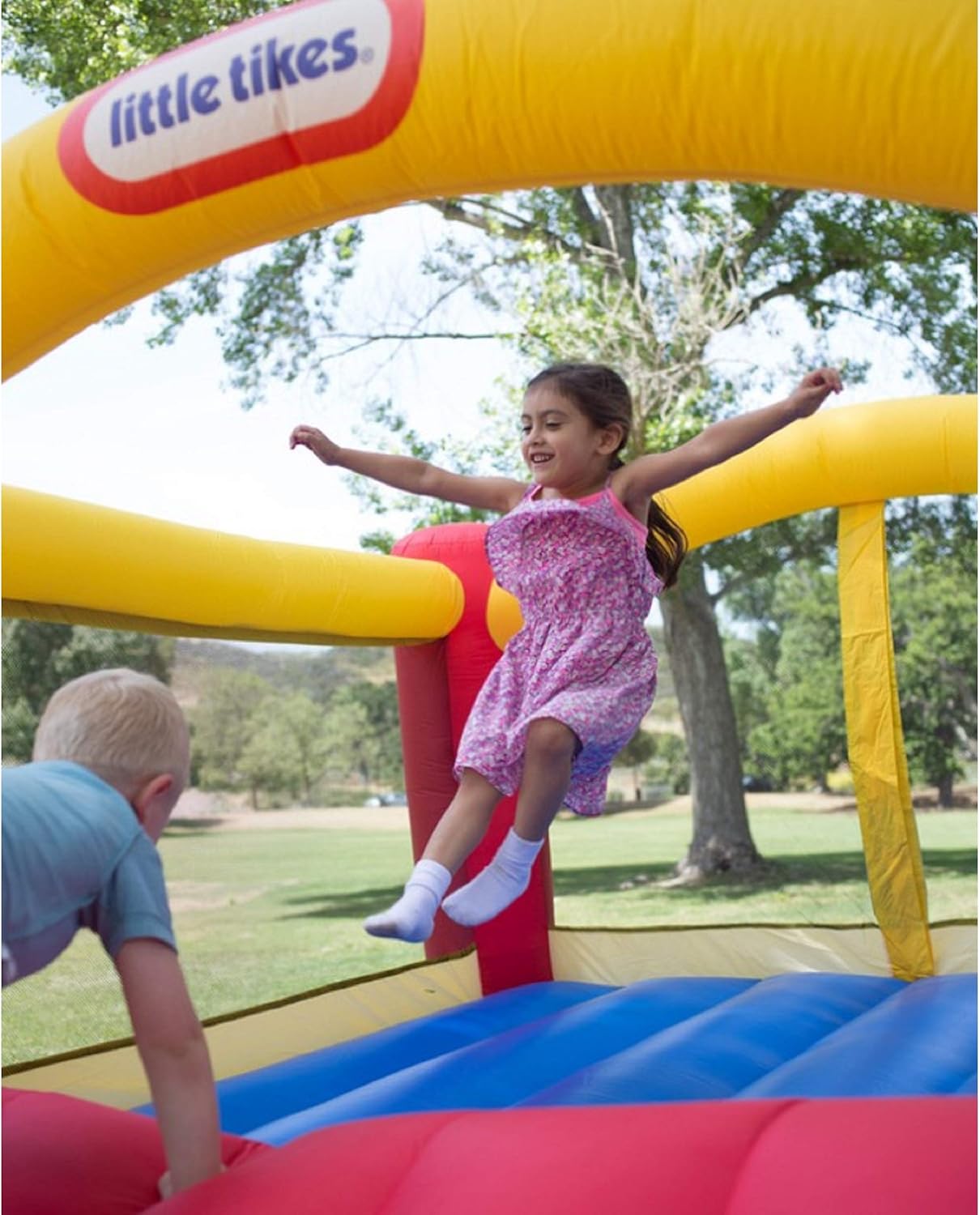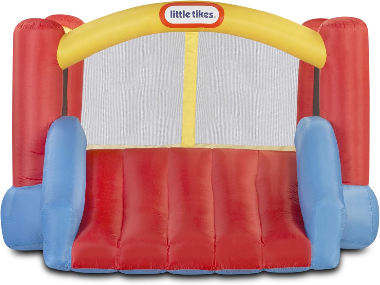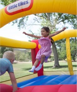 - TOUGH AGAINST WEAR AND TEAR : Little Tikes Bounce House is made of polyester. Durable for kids jumper made with solid double stitch seams to protect the fabric against rips and tears. Great kids bounce house as outdoor playhouse slide galore. Inside bounce area: 84.00 L x 84.00 W x 47.50 H (inches)