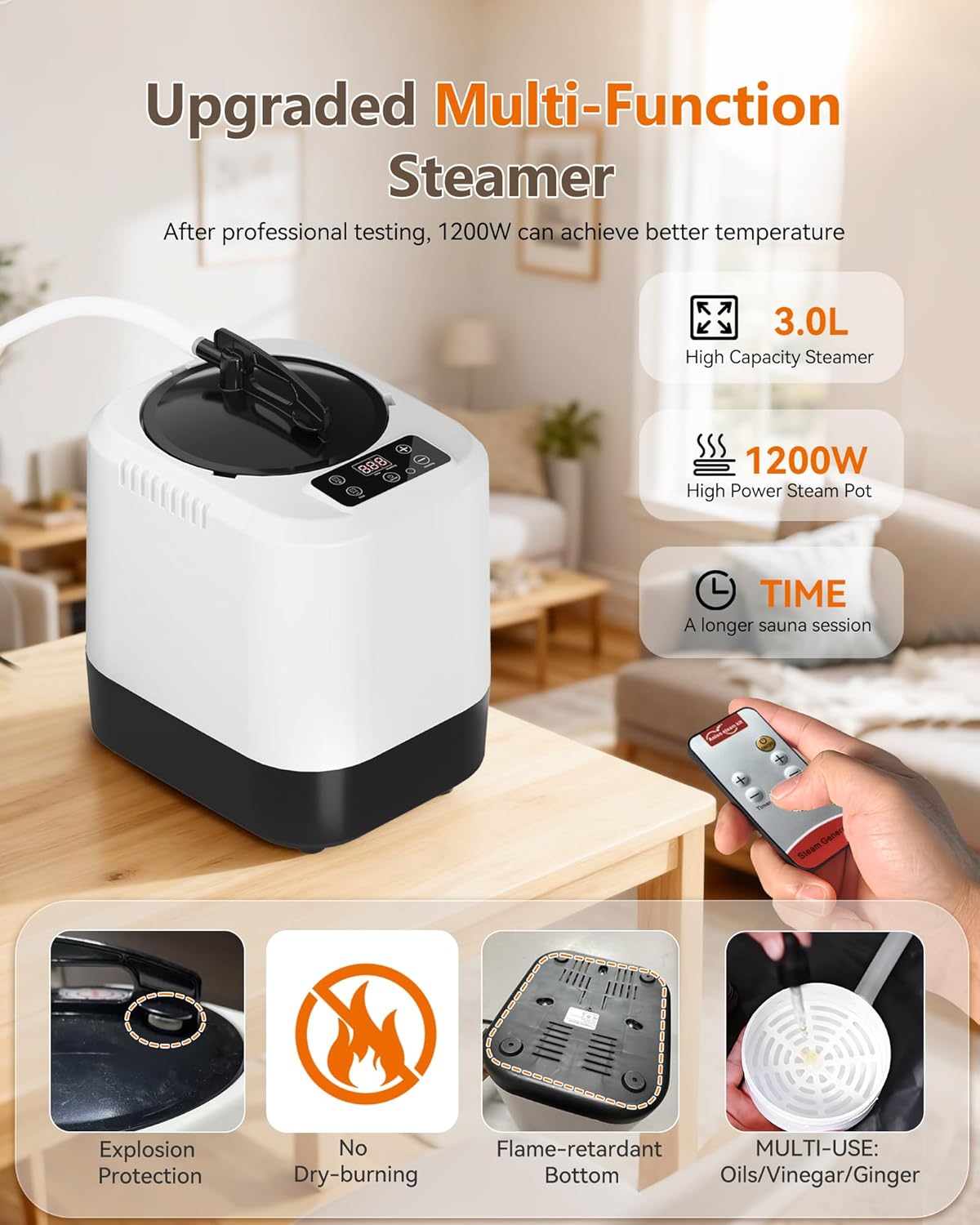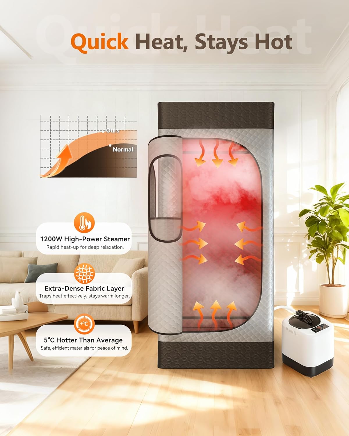 - 【Powerful 3L 1200W Steamer for Fast Heating】Our high- performance portable sauna for home 1200W steam generator with a large 3L water tank heats up in just 5 minutes (up to 130°F). The 360° steam nozzle evenly fills the spacious sauna tent for a relaxing, full-body experience, with 9 adjustable heating speed settings for personalized comfort.