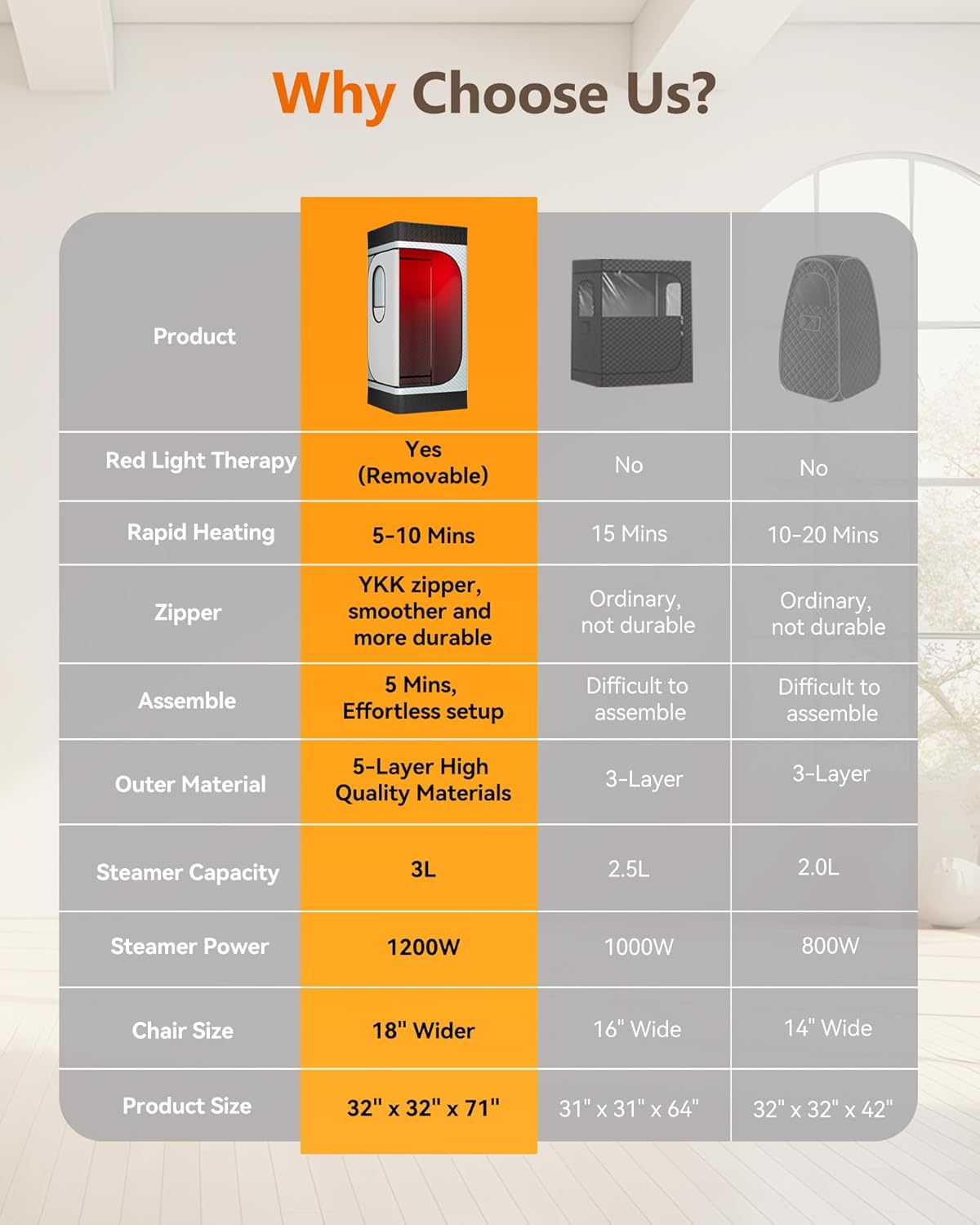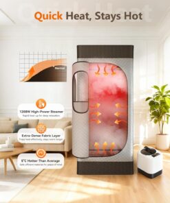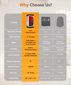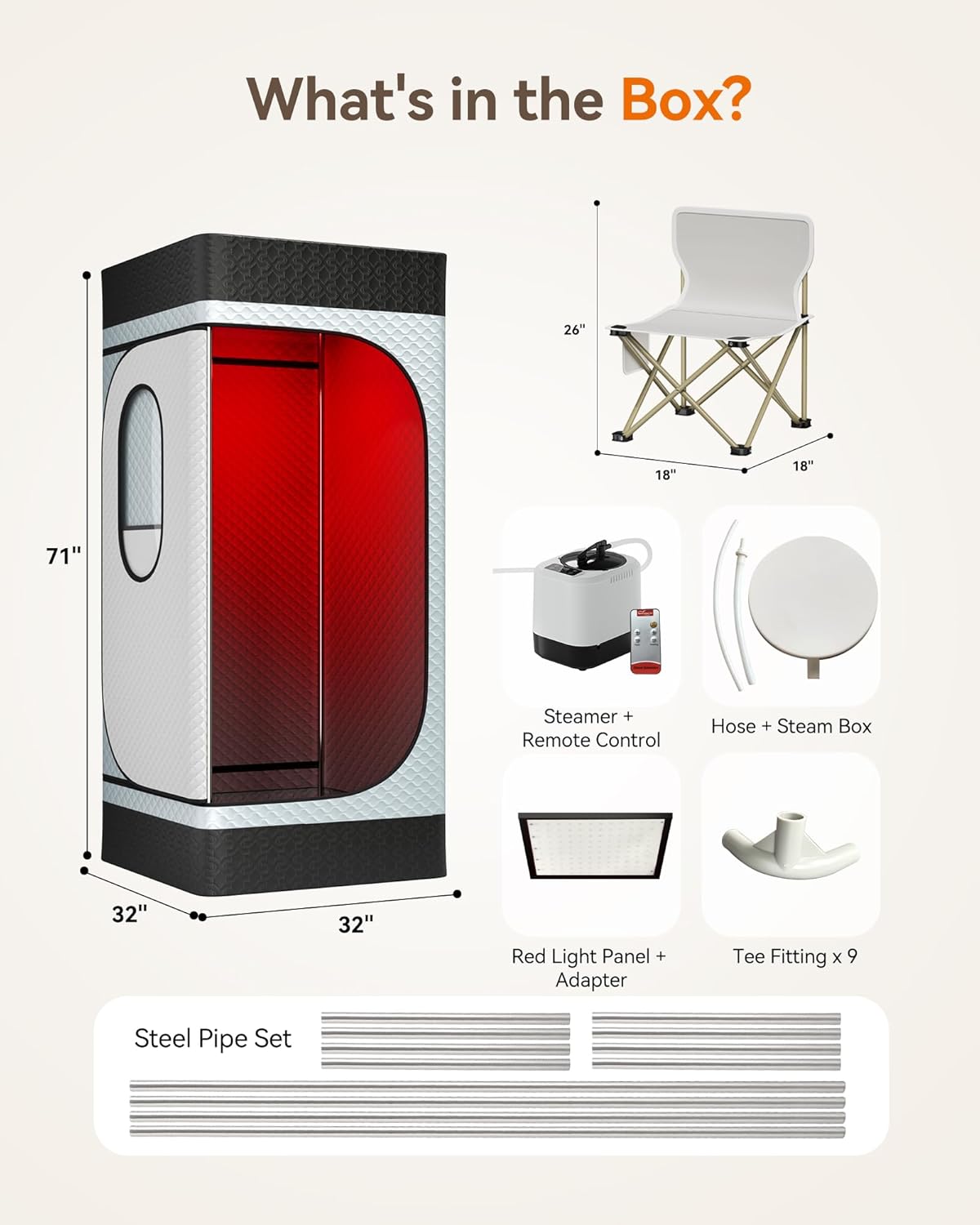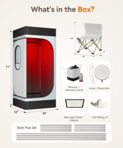 - 【Spacious & Comfortable for All Users】Generous 32″ x 32″ x 71″ interior of personal sauna box fits users of all sizes. The heavy-duty folding chair (18″ x 18″ x 26″) features waterproof Oxford fabric and a reinforced steel frame, supporting up to 450 lbs for maximum stability and durability.