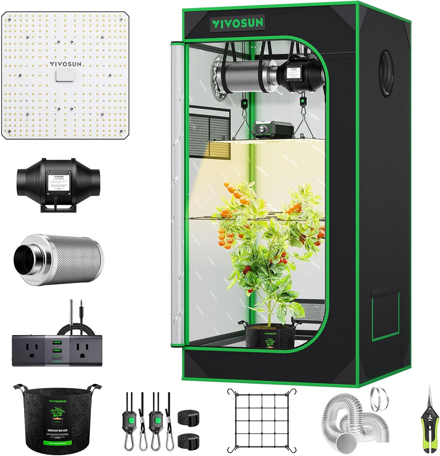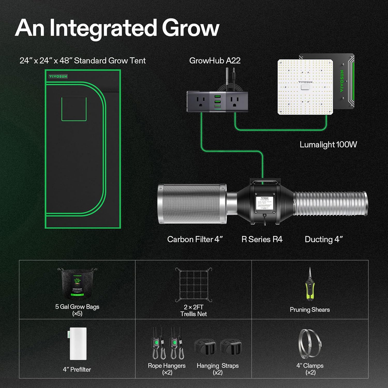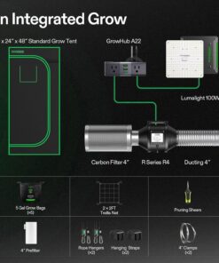 - Complete Growing Kit: 24″ × 24″ × 48″ Standard Grow Tent; LumaLight 100 W Grow Light; 4″ R4 Duct Fan; GrowHub A22; 4″ Carbon Filter; 4″ Ducting; 4″ Clamp × 2; 4″ Prefilter; 5 Gal Grow Bag × 5; 2 × 2ft Trellis Net; Pruning Shears; Rope Hangers; Hanging Straps