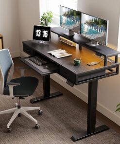 AODK Electric Standing Desk 55 in with Drawers Keyboard Tray Power Outlets and LED Lights